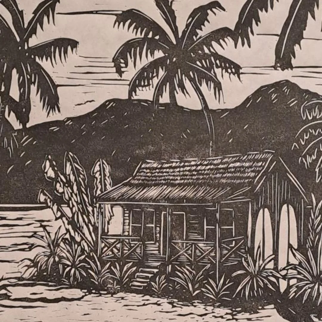 Tucked between lush mountains and dense tropical growth, a humble beach shack rests as a symbol of a slower, more intentional way of living. Two longboards rest against its walls, hinting at shared stories, sun-faded days, and a life shaped by the tides.